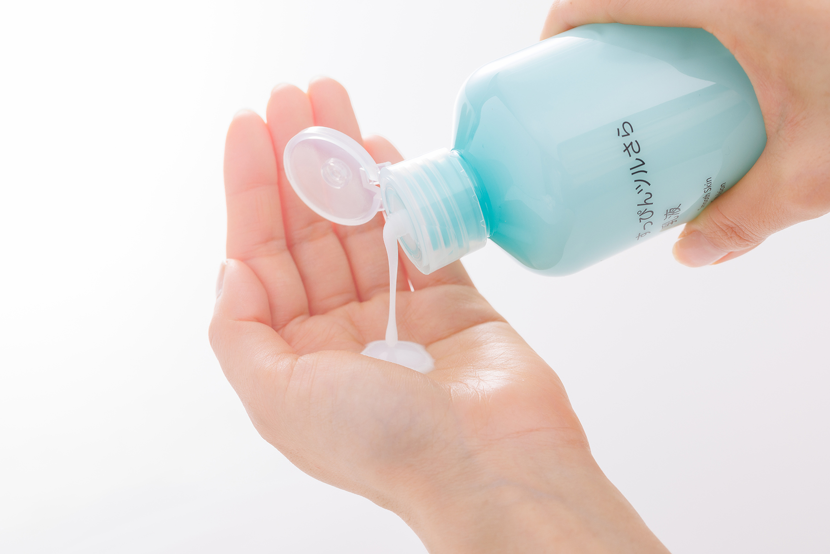 化粧水や美容液を塗った後、10円玉大くらいの乳液を取り掌の体温でなじませます。