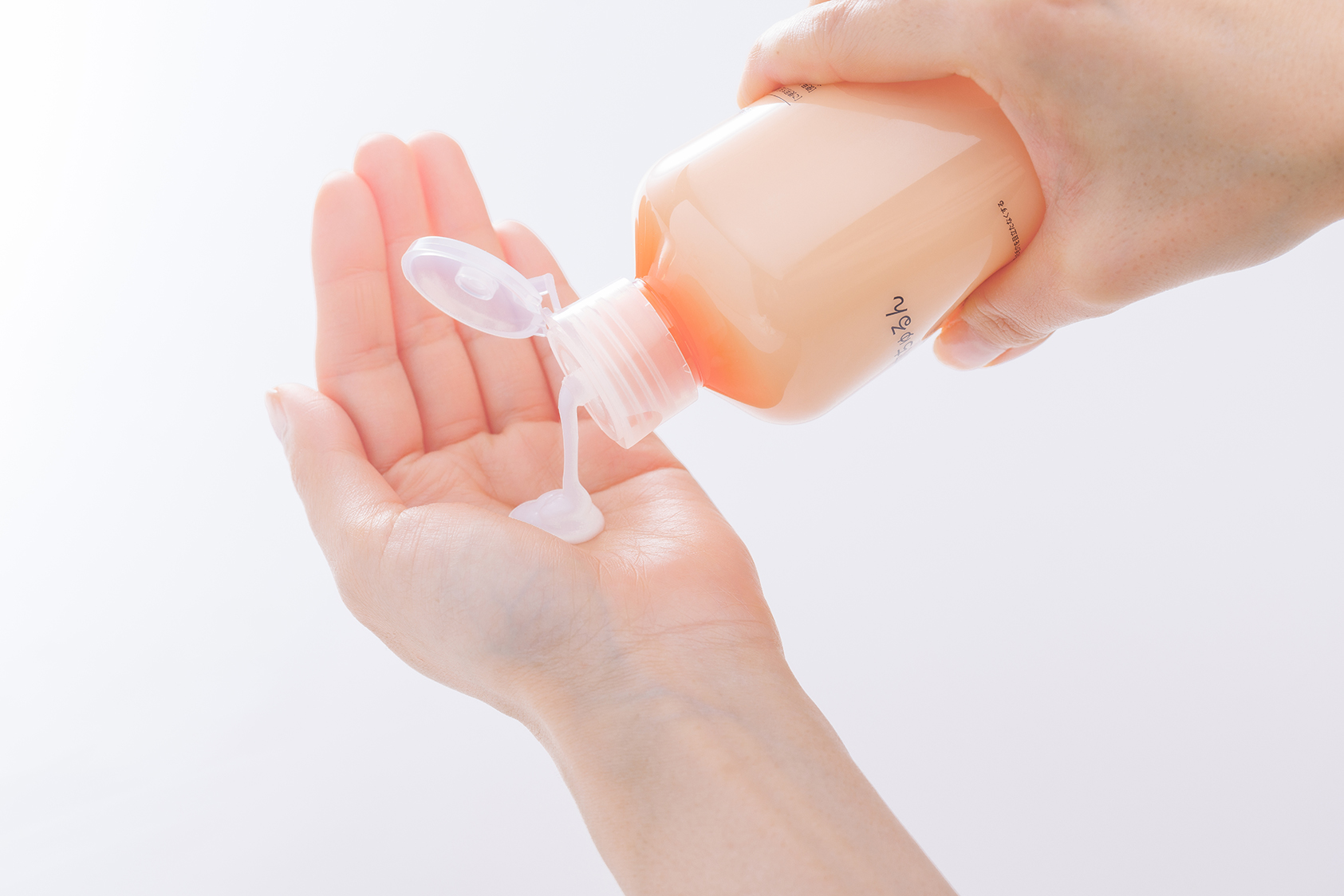 化粧水や美容液を塗った後、10円玉大くらいの乳液を取り掌の体温でなじませます。